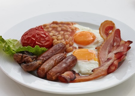 Full English breakfast, eggs, bacon, sausages, breads and fruits