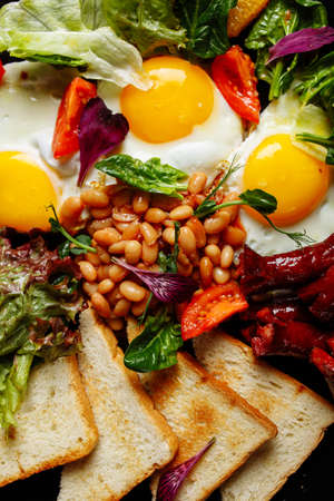 English breakfast with fried eggs, beans, grilled sausages and toasts