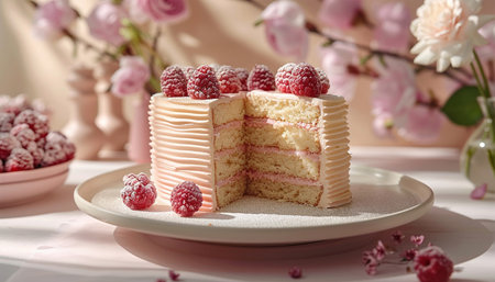 AI Generated. Delicious Slice of Pink Cake with Berries and Cream