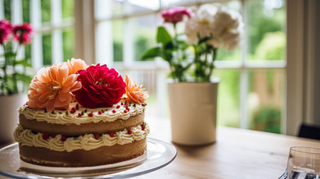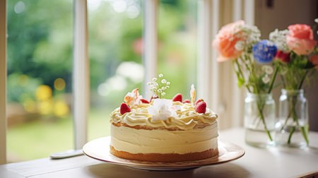 Birthday Cake with Lit Candles and Festive Confetti, a Celebration by the Sunny Window, Sweet Treat