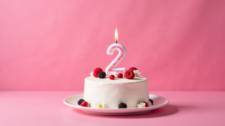 A delightful white birthday cake decorated with berries and flowers sits on a pink background. A pink number two candle is lit, signifying the joyous second birthday celebration..