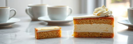 Sliced cake accompanied by coffee cups on a marble table in a well-lit cafe