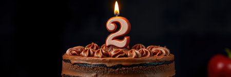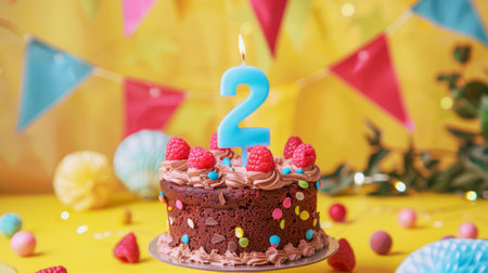 Chocolate cake with number 2 candle on yellow background surrounded by colorful garland