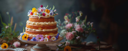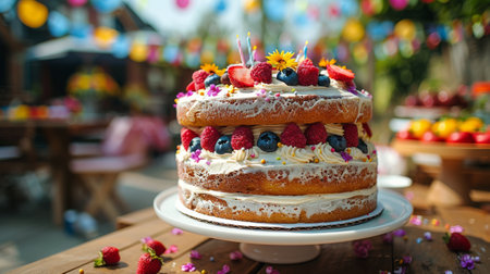 Festive Dairy-Free Birthday Cake with Edible Flowers and Fruit Toppings.