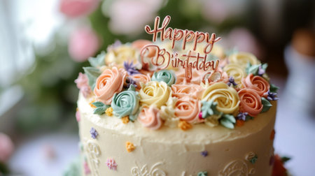 A close-up of a beautifully decorated birthday cake with colorful icing flowers and a 'Happy Birthday' topper, set against a simple background.