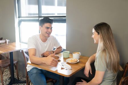 Handsome young man talking and enjoying coffee with his date in a bakery shop