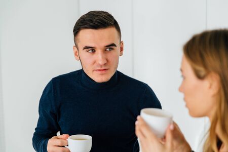 Best friends, man and woman, talking to each other, during drinking tea. At home.