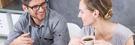 Coworkers chatting relaxed during coffee break sitting on chairs