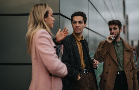 Young people walking in the street and talking to each other. Group of friends having fun together.
