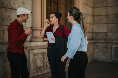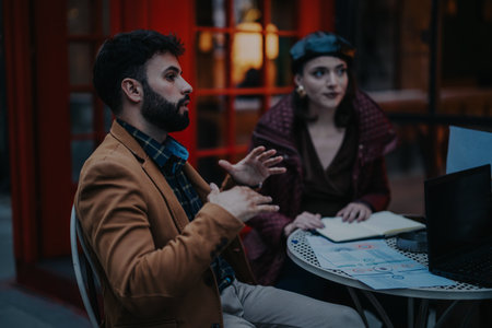 Business colleagues having a strategic meeting outdoors discussing project analysis and profitability