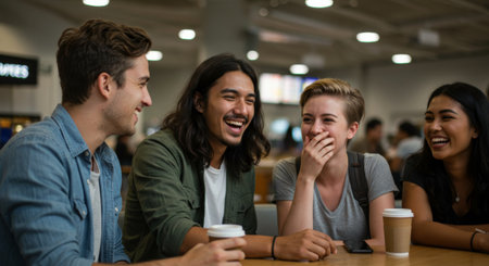 A group of friends are laughing together at a cafe, enjoying coffee and good times. The atmosphere is filled with joy and friendship and community bond.