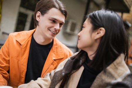 Smiling man looking at blurred asian girlfriend in blanket in outdoor cafe