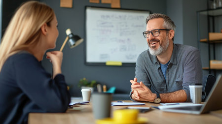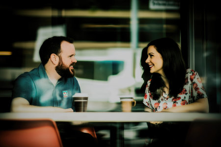 Minimalist Close-Up Advertising with Happy Man and Woman in Conversation at Café.
