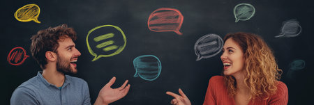 Two young adults, a man and a woman, laughing and engaging in an animated discussion against a blackboard filled with colorful speech bubbles, embody vibrant communication