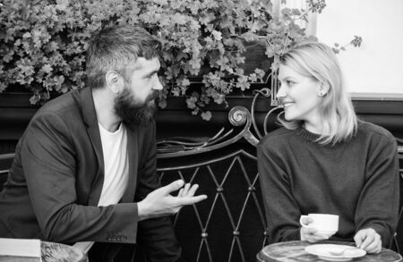 Meeting people first date. Couple terrace drinking coffee. Casual meet acquaintance public place. Romantic couple. Normal way to meet and connect with other single people. Meet become acquaintances