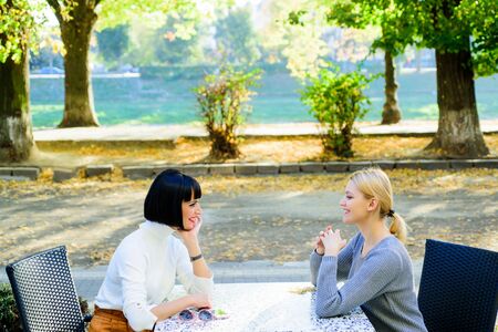 Female friends sit in coffee shop and enjoy talk. Friendship meeting. Togetherness and female friendship. Conversation of two women cafe terrace. True friendship friendly close relations. Trust her