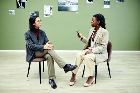 African American woman sitting on chair holding voice recorder interviewing modern young Asian photographer on first exhibition day in art gallery