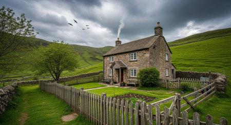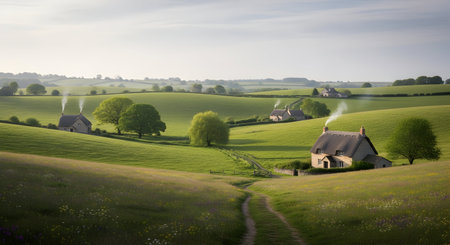 idyllic countryside, featuring a charming farmhouse nestled among rolling hills, and a meandering stream inviting contemplation and relaxation. Generative AI