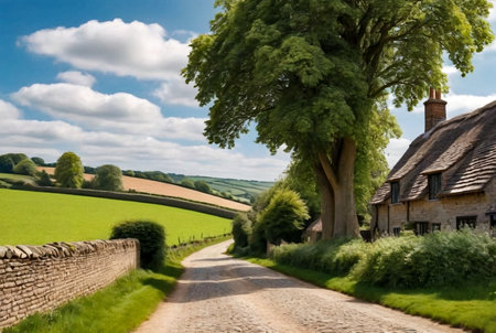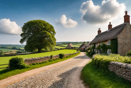 View of bright scenic landscape: cobblestone street english greenery village, summertime countryside scenery. Serene rural scene. Travel tourism trip concept. Gen ai illustration. Copy ad text space
