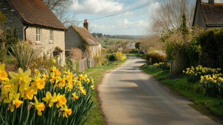 A picturesque country road is surrounded by vibrant daffodils, leading to charming cottages under a clear blue sky, showcasing peaceful rural life.