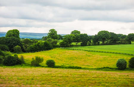 High dynamic range (HDR) English countryside seen from a train near Preston, with selective focus on the horizon and motion blur on the foreground
