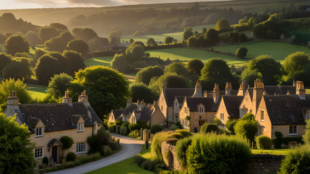 Aerial view of a cottage town amidst rolling hills, charming houses, idyllic countryside, peaceful surroundings, detailed and scenic depiction Generative AI