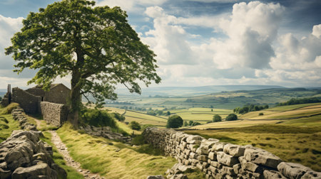 stone wall and path in a scenic field captured in the style of hasselblad h6d-400c. this stock photo showcases the beauty of british topographical landscapes, combining the rustic charm of a stone wall with a winding stone path amidst a picturesque field. ai generated