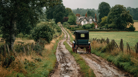 A vintage carriage travels along a scenic rural road, flanked by lush greenery and a charming countryside home, evoking feelings of nostalgia and tranquility.