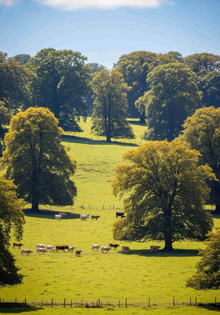 a traditional british landscape featuring fields, trees, and a plowed field. the photo showcases spectacular backdrops and is captured using the tamron sp 70-200mm f/2.8 di vc usd g2 lens. the colors of green and brown dominate the scene, with free-flowing lines adding a sense of movement. the composition is landscape-focused, reminiscent of the art of kintsugi. ai generated
