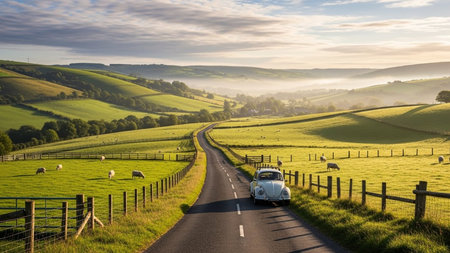 A light blue vintage car drives on a winding asphalt road through lush green rolling hills. Sheep graze in fenced pastures on either side. Morning mist hangs in the distance under a cloudy sky.