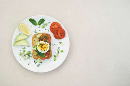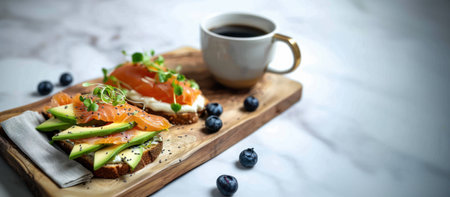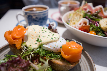 Egg Rossini and Fresh Salad Breakfast, Minimalist Gourmet Brunch on Marble with Coffee