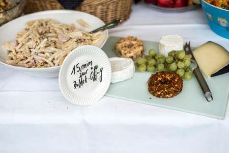 Cheese plate Variety of cheese sorts with grapes and buffet table with food
