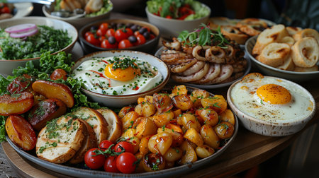 A delightful assortment of brunch dishes is beautifully arranged on a wooden table showing freshness.