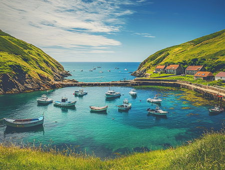Picturesque coastal village nestled in a sheltered cove with traditional fishing boats moored in the tranquil harbor waters surrounded by verdant hills and cliffs