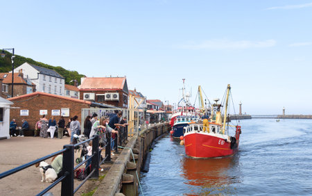 Whitby in England: Fishing boats docked at a harbor with people standing along the pier on a clear day.