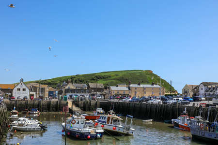 WEST BAY, UK - OCTOBER 10, 2022 - View of traditional fishing boats moored in the harbour at low tide with the town and countryside to the rear, West Bay, Dorset, UK, Europe, October, 2022.
