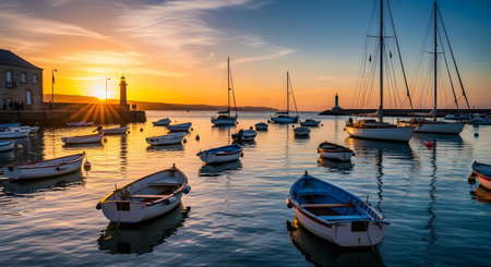 A tranquil harbor is filled with small fishing boats and sailboats at sunset. The sky is a vibrant orange and yellow, reflecting on the calm water. A lighthouse and coastal town buildings are silhouetted against the colorful sky.