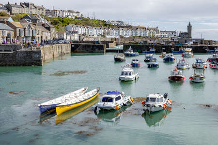 PORTHLEVEN, CORNWALL, UK - MAY 11 : View of the town and harbour in Porthleven, Cornwall on May 11, 2021. Unidentified people