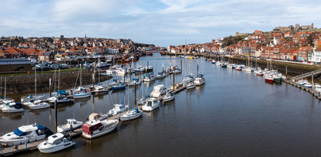 WHITBY, UK - MARCH 12, 2023. An aerial landscape of the River Esk Marina and seaside town of Whitby in North Yorkshire