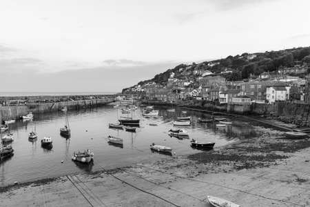 Mousehole.Cornwall.United Kingdom.July 24th 2021.Black and white photo of the fishing village of Mousehole in Cornwall on a summer evening