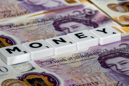 Scrabble tiles spelling MONEY are placed on a background of British 20 pound notes, showcasing the concept of wealth and finance.