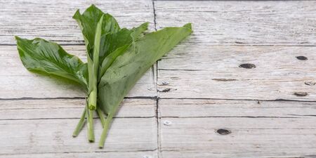 Plantain leaves on a wooden background.
