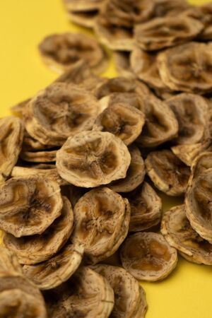 selective focus, home preparation, banana chips, circles of dried bananas