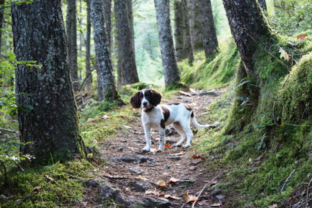 Working English Springer Spaniel stood on a woodland path