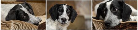 Portrait of a spotted puppy with sad eyes, close-up. Collage