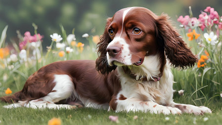 English springer spaniel dog sitting in meadow field surrounded by vibrant wildflowers and grass on sunny day ai generated