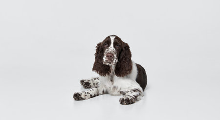 Portrait of purebred english springer spaniel dog lying on floor and looking upwards isolated over grey background. Concept of motion, domestic pets, animal life. Copy space for ad
