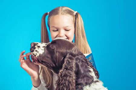 Child cute school girl take a book and play with her dog on blue background