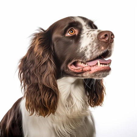 the springer spaniel, with its gentle eyes and floppy ears, poses elegantly against a pristine white background, showcasing its beautiful liver and white coat, highlighting its friendly and outgoing personality, a perfect representation of this popular breed's charm and affectionate nature. ai generated