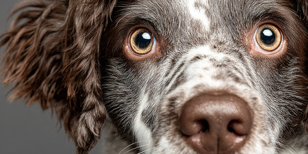 close up of a senior dog in home. Springer Spaniel breed. Indoors